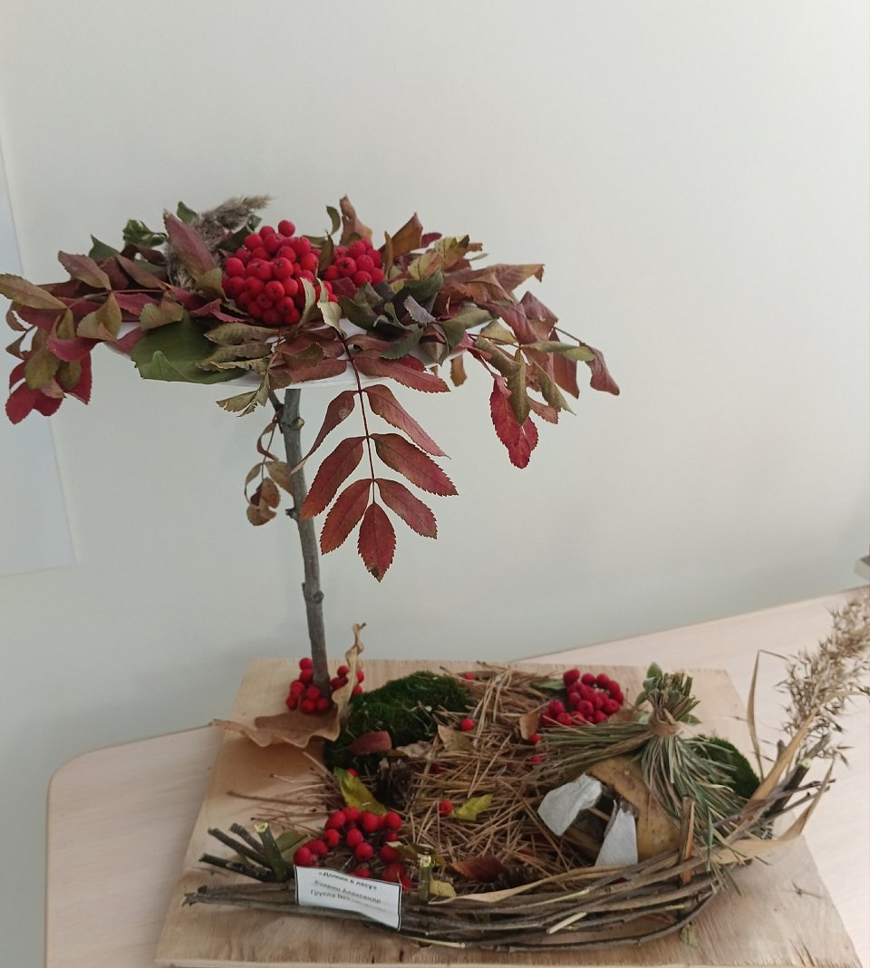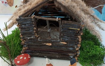 Для данной работы были использованные природные материалы( рябина, прутики, листья, мох, хвоя , трава), дом сделан из картофеля.
