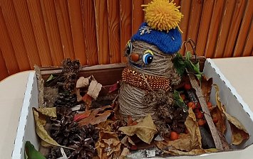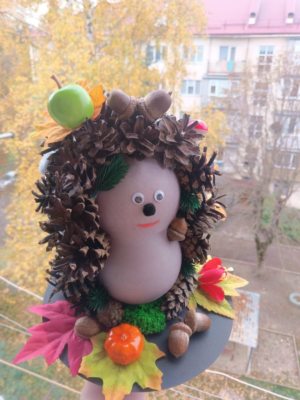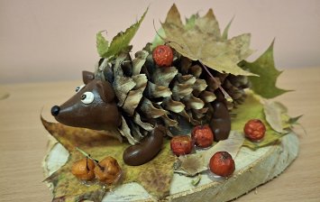 Для выполнения осенней поделки использовались шишки, желудь, листья, елочные веточки и иные декорации
