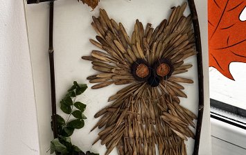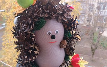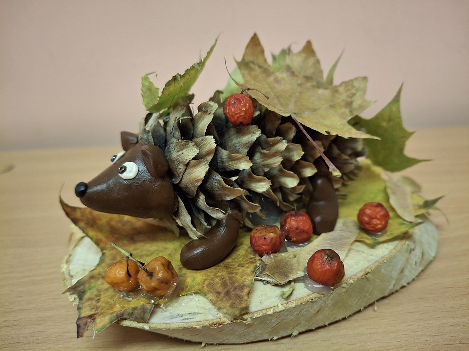Работа выполнена из еловой шишки с добавлением осенних листочков и ягод рябины на оригинальной подставке из дерева.