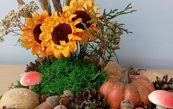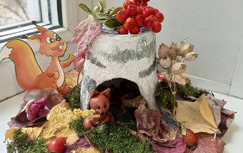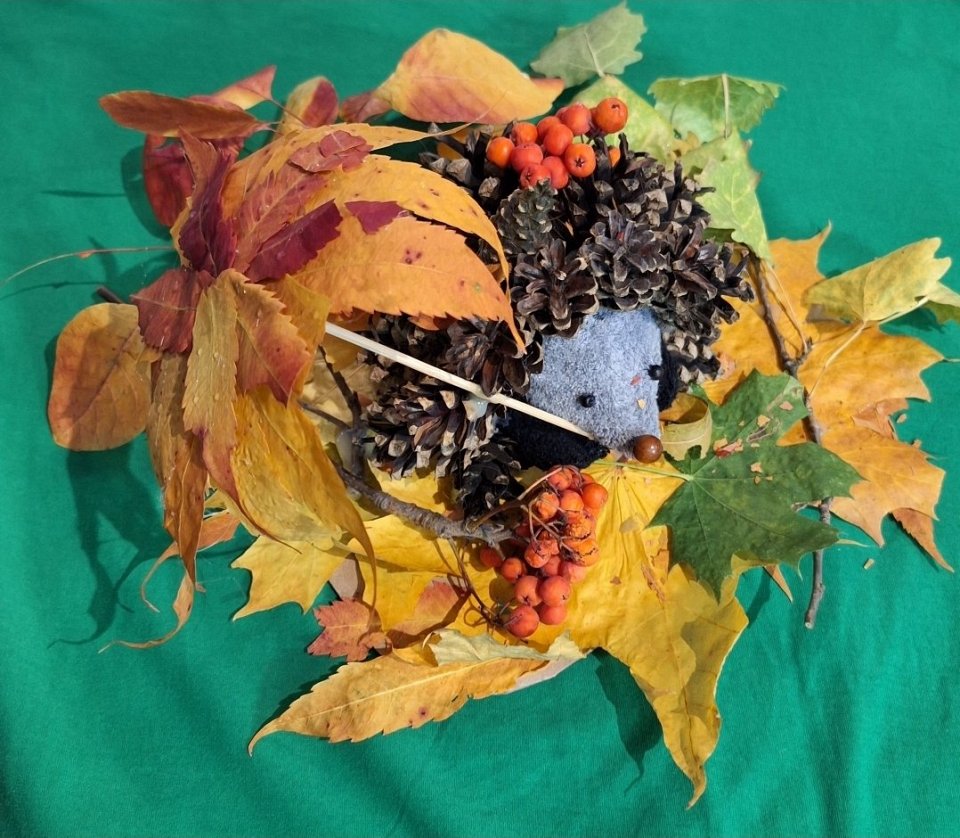 В работе использованы - листья, шишки, гроздья рябины, палочки, а также горячий клей, махровый носок, бусины, картон