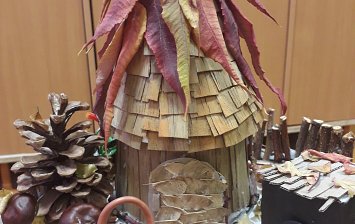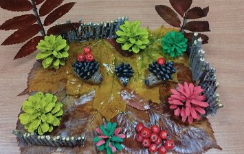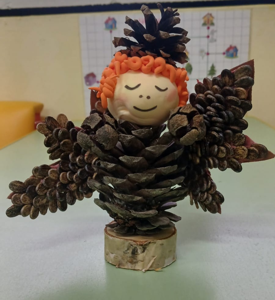 Поделка сделана из природных материалов: туловище из шишек, крылья из арбузных семечек, подставка из берёзового спила. Голову и волосы сделали из воздушного пластилина.