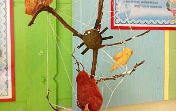 Работа выполнена из листьев, картона, декоративной бумаги и фоамирана совместно с педагогами и родителем.