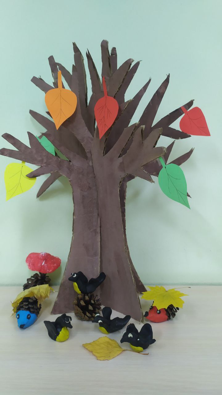 Использованный материал: картон, краска, бумага, пластилин, природный материал.