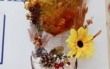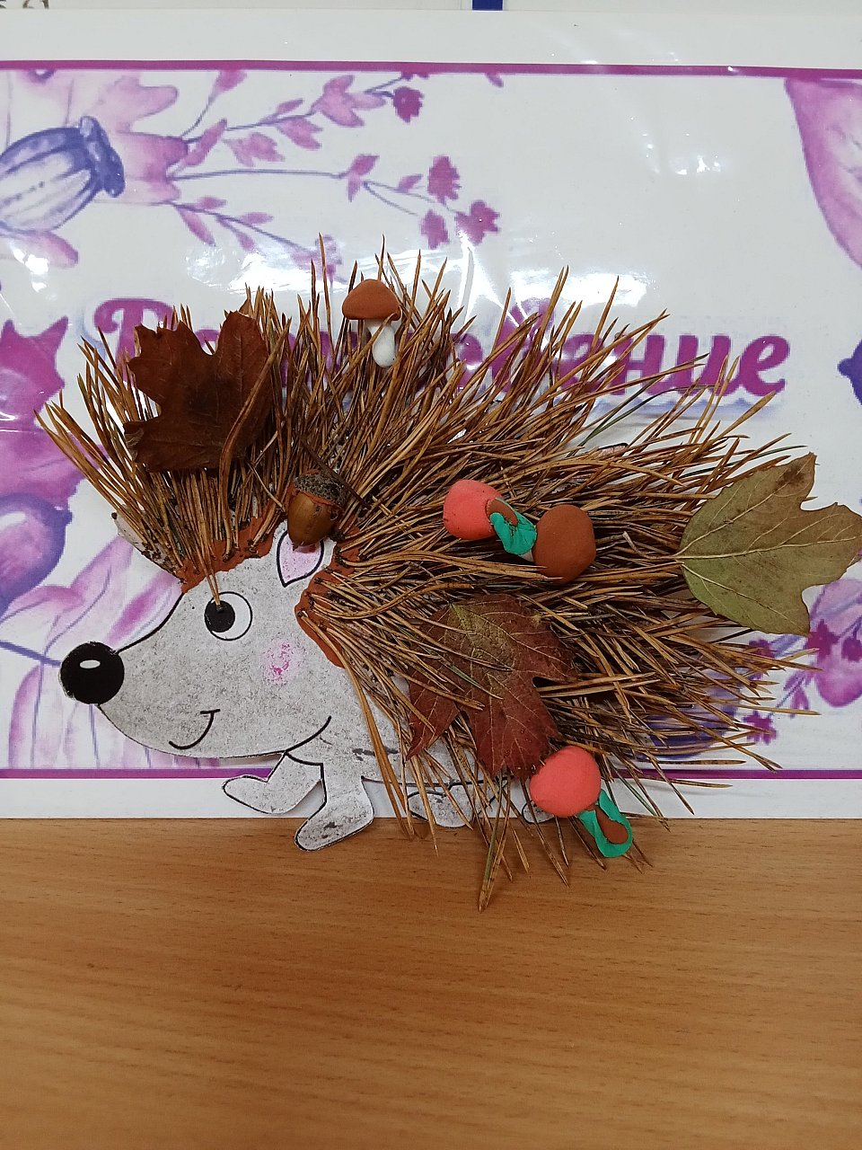 4 года, поделка, бумага, листья деревьев, иголки сосны, пластилин.