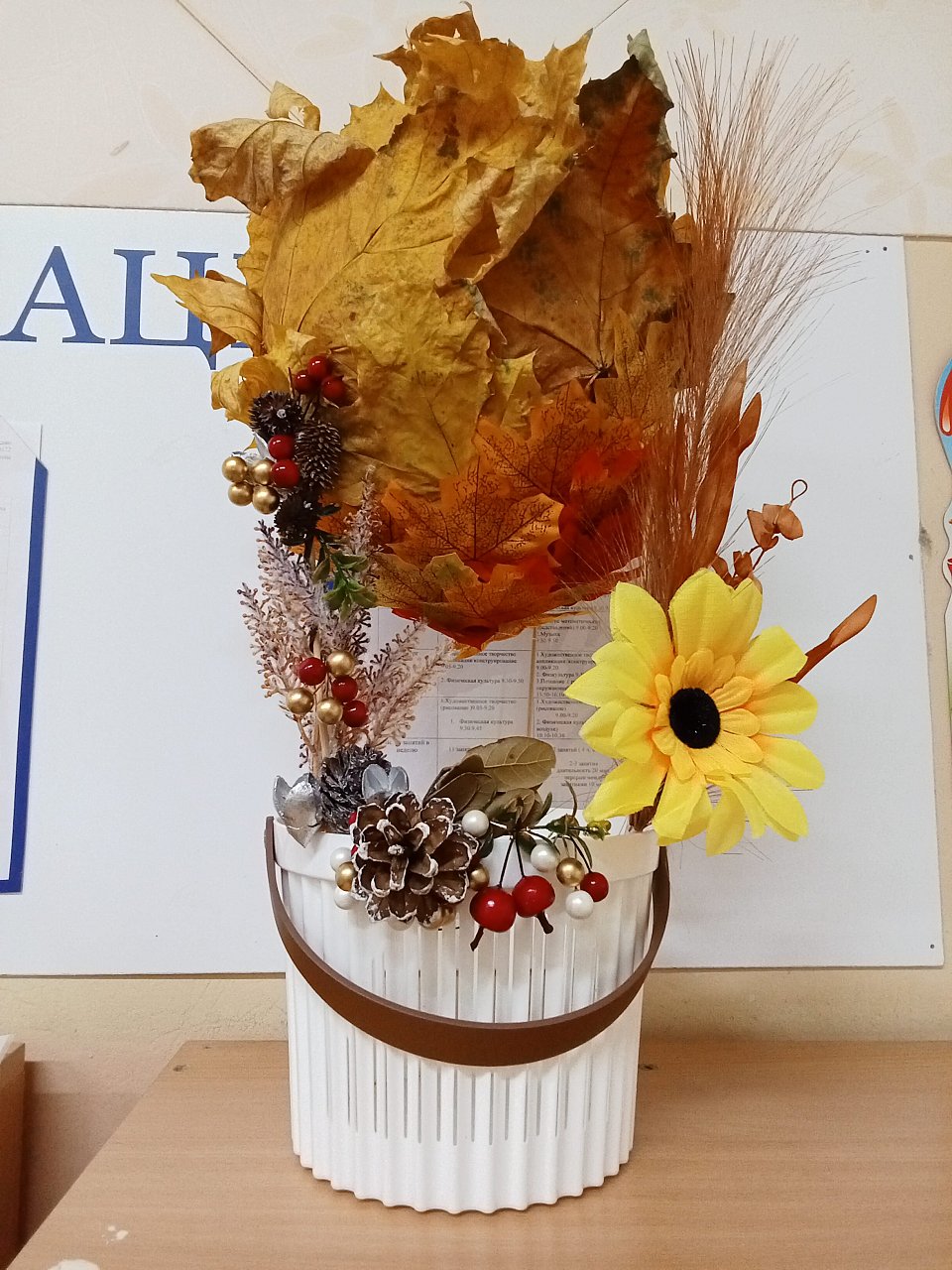 4 года, поделка, листья деревьев, пластик, клей, искуственные ягоды и цветы.
