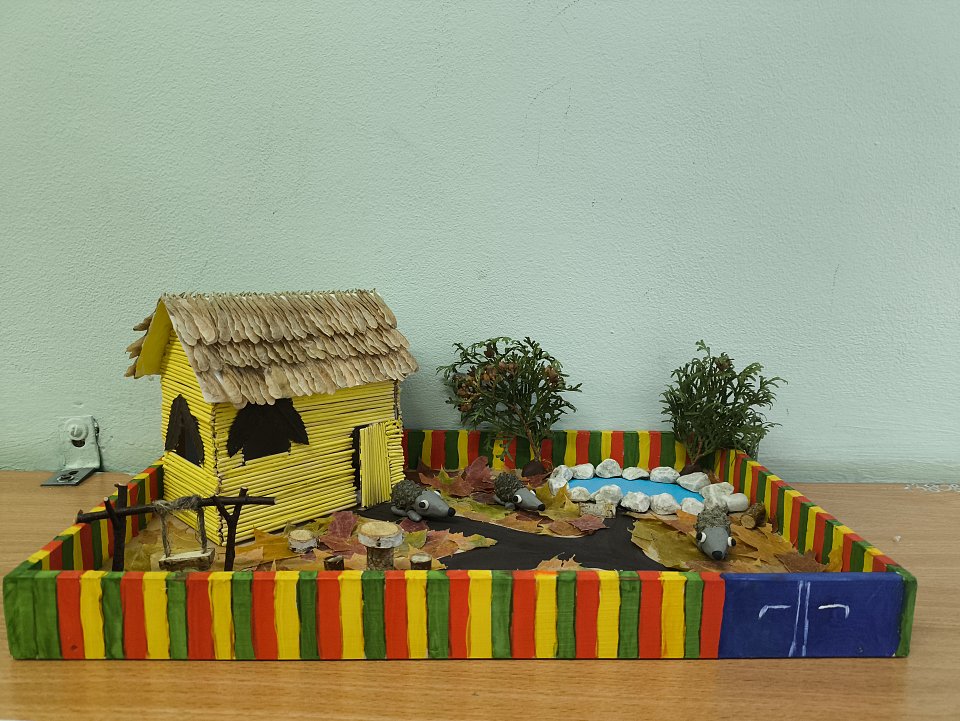 Ежи у избушки, гуляют в осеннем дворе. шишки, пластилин, веточки, листья