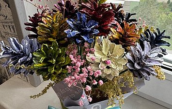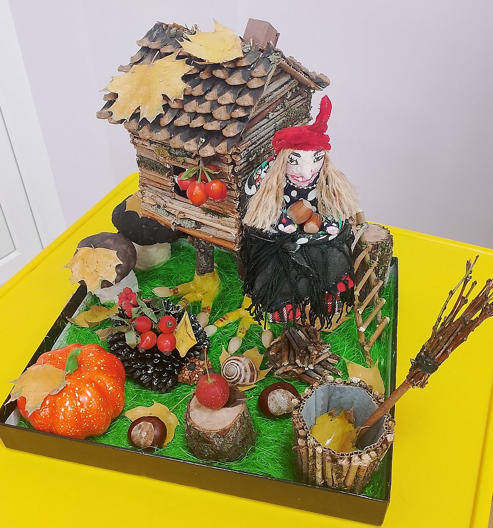 Трёхлетний Илья вместе с мамой выполнил необыкновенно яркую, креативную объёмную композицию с использованием природных и искусственных материалов. Здесь и натуральная тыква, и сосновые шишки, и крошечные пенёчки, и плоды каштана, шиповника, фундука, и осенние листья, и райское яблоко, и веточки деревьев, и семена подсолнечника и тыквы., и панцирь улитки., и пенька. А также 4 вида ткани, обычный и воздушный пластилин, картон, искусственная трава, акриловые краски.
