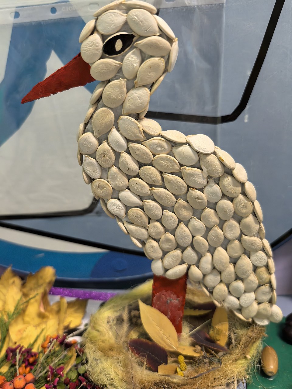 Работа сделана из картона, семечек тыквы и пуха камышей.
