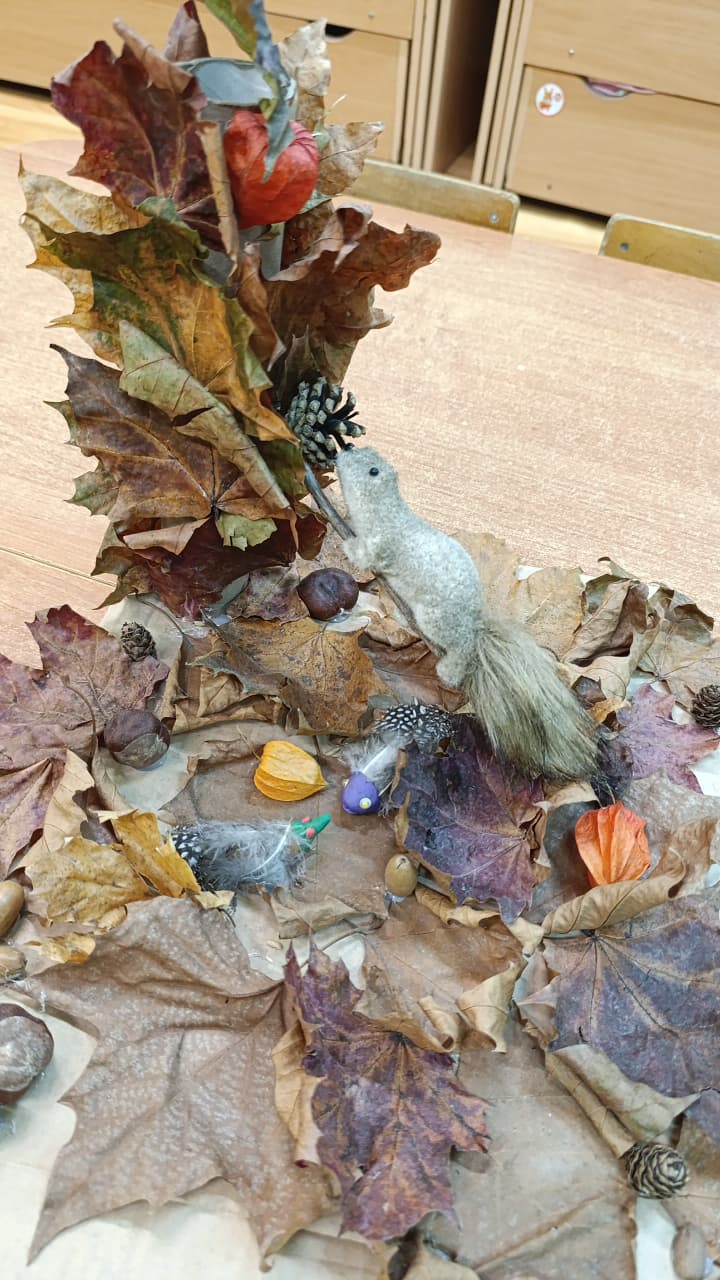 листья, каштаны, еловые ветки и белочка
