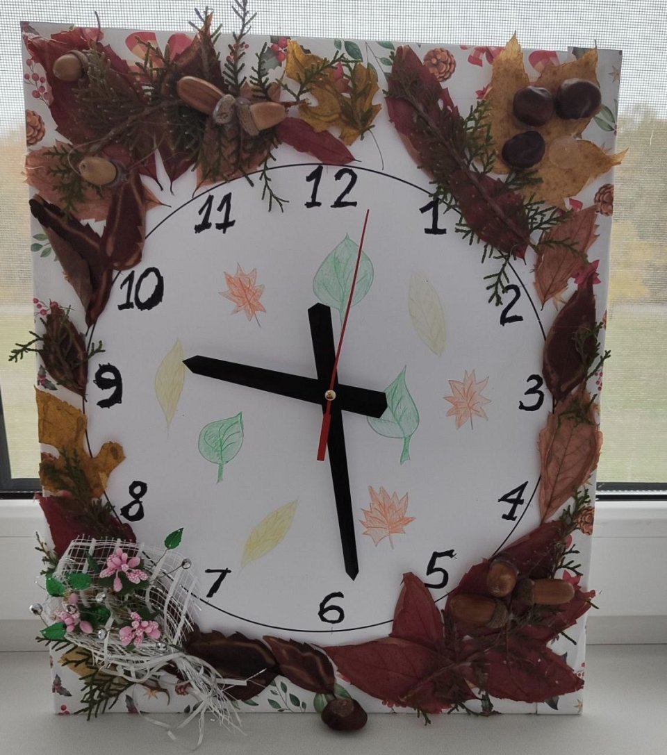 8 лет, природный материал, карандаши, фломастеры, часовой механизм.