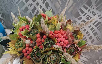 10 лет, пано из природных материалов, листья, ветки можжевельника, цветы лабелии.