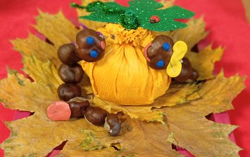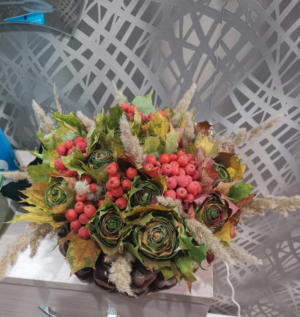 9 лет. Работа выполнена из природных материалов. Каштан используется для создания вазы. В вазе красуются розы , сделанные из кленовых листьев. Шикарный букет дополняет алая рябина и колоски. Разнообразное сочетание красок в этой композиции передает колорит прекрасного времени года - осень.