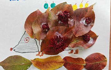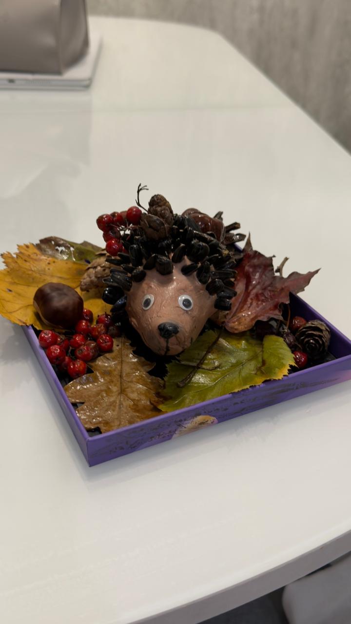 Поделка Ёжик, выполнена из природных материалов:листвы, рябины,каштанов,шишек и семечек