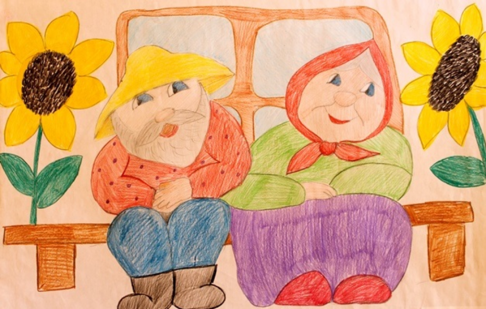 15 лет, рисунок бабушки дедушки нарисован цветными карандашами.