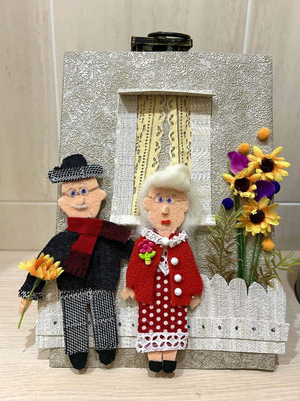 В работе использовала картон, ткань, кружево, искусственные цветы, обои, клей.