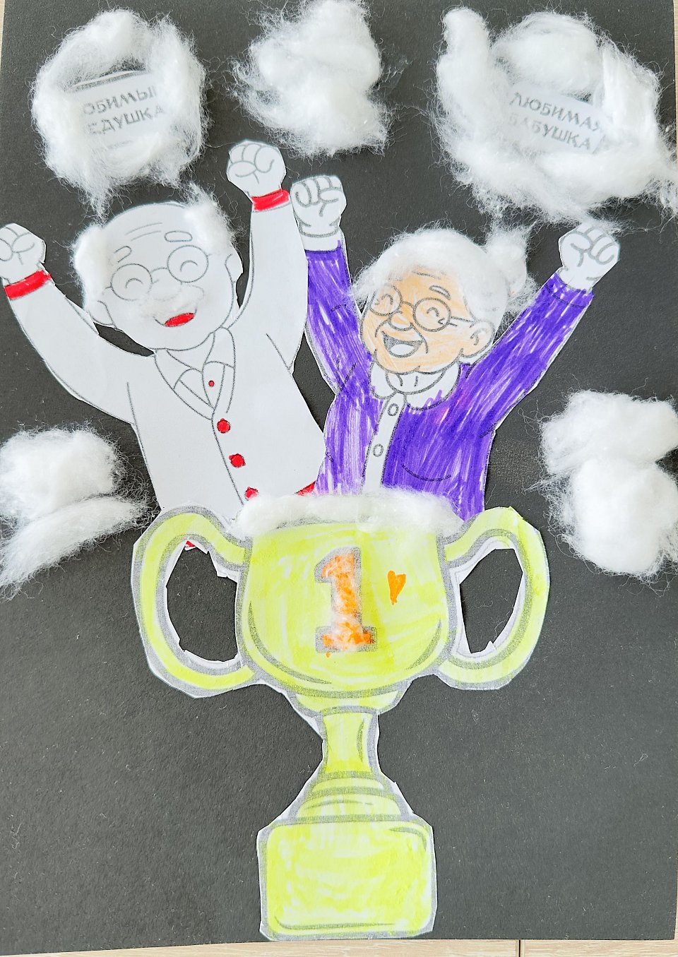 Выполнено из бумаги,клея и ваты,использовали картон,цветные карандаши.
