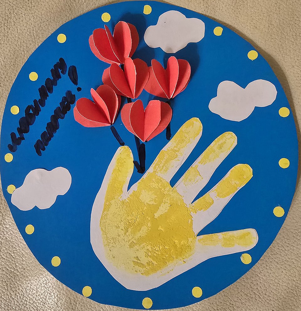 Катюша, 3 года. Открытка выполненна апликацией. Использовались клей, картон, цветная бумага, детская ручка в качестве шаблона, маркер.