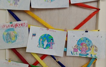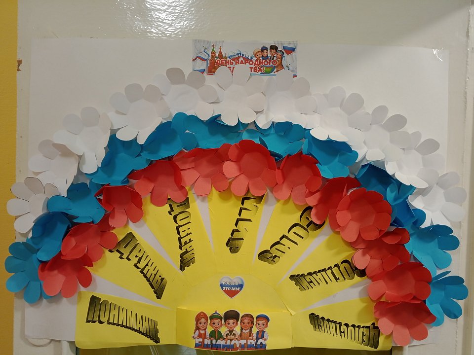 Аппликация из цветных трафаретов в виде цветов в политре цветов флага России.