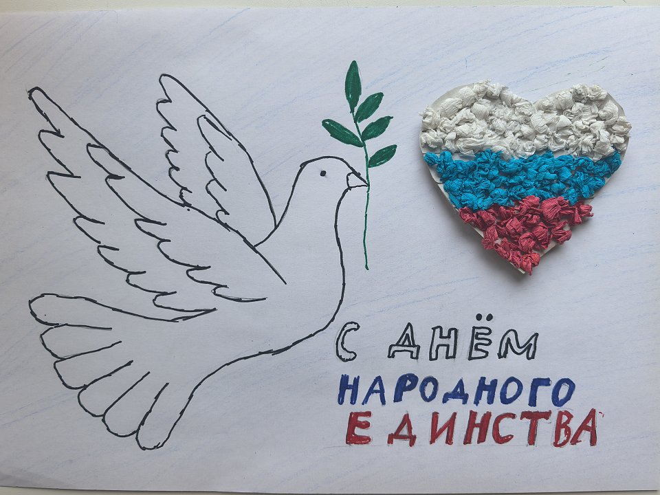 Участнику 10 лет, ученик 4 класса. Работа выполнена комбинированным стилем. Основа - творческий рисунок и справа расположено сердце в цветах триколора - поделка, сделанная в специальной технике, где рвутся маленькие кусочки бумаги, комкаются и клеятся на клей