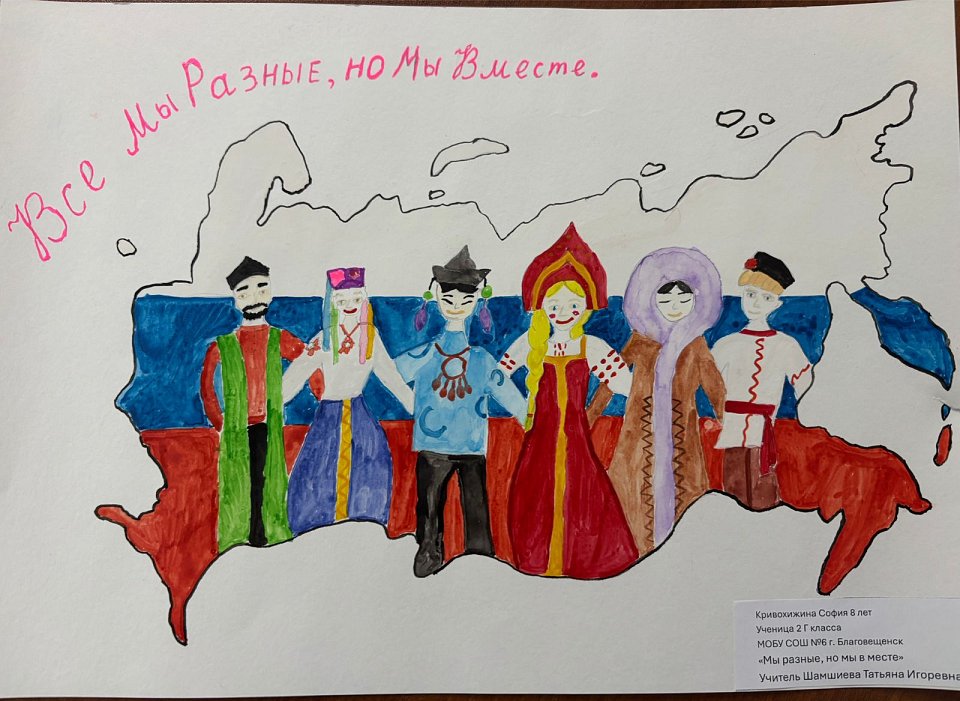 София 8 лет. В рисунке изображены люди разных народов, но они все вместе. Рисунок нарисован на листе формата А3 акварельными красками, также использовался простой карандаш.