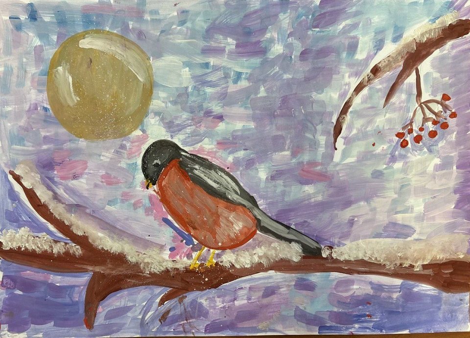 Маленький снегирь, как осенний огонёк в белой тишине, приютился на снежной ветке. Его тёплая грудка словно приглашает погреться взглядом в холодный день. Картина дышит спокойствием и зимней сказкой — здесь слышен только лёгкий шорох снега и сердце наблюдателя.