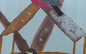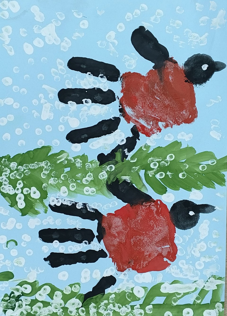 Работу выполнил ребенок в возрасте 4 лет, с помощью отпечатка ладошки, работа была дополнена деталями- ветки ели, падающий снег. Материал: гуашь