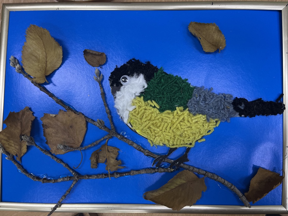 13 лет, нетрадиционная аппликация, резаные нитки, нитки, клей ПВА, картон, сухие истья, ветки.