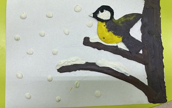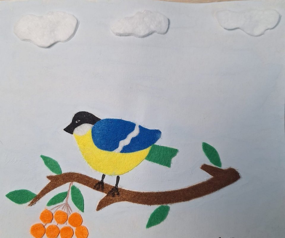 Аппликация "Синица на ветке" Работа выполнена учеником 1 класса (7 лет). Для работы использованы материалы: картон, фетр, краска "Гуашь", вата, клей ПВА.