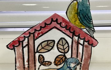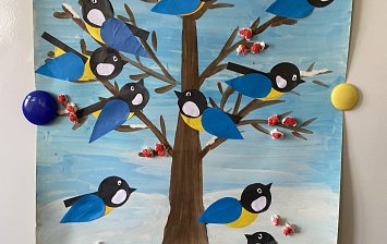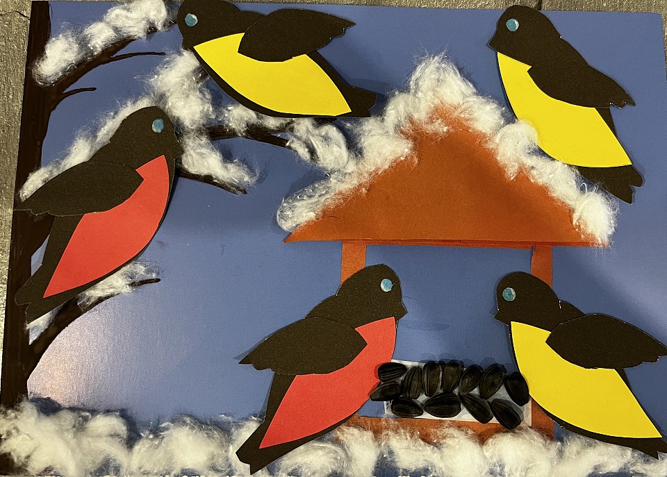 Работа выполнена в технике аппликации и коллажа. На голубом фоне изображена кормушка для птиц, окруженная пушистыми облаками снега из ваты. Птицы, сидят на кормушке и рядом с ней. Семена на кормушке добавляют реалистичности и привлекают внимание к деталям.