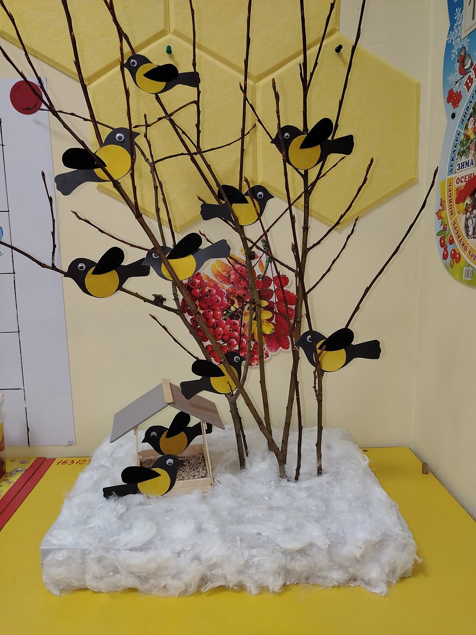 Возраст участников 5 лет. Пенопласт, вата, ветки деревьев, деверенные палочки для кормушки, крупа, картон простой, картон бархатный, глазки, клей ПВА, клей пистолет.
