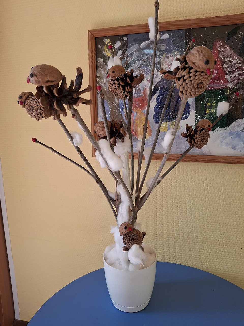 Работа выполнена дошкольником с поддержкой родителей. Для работы были выбраны ветки , шишки, орехи и вата для образа снега .