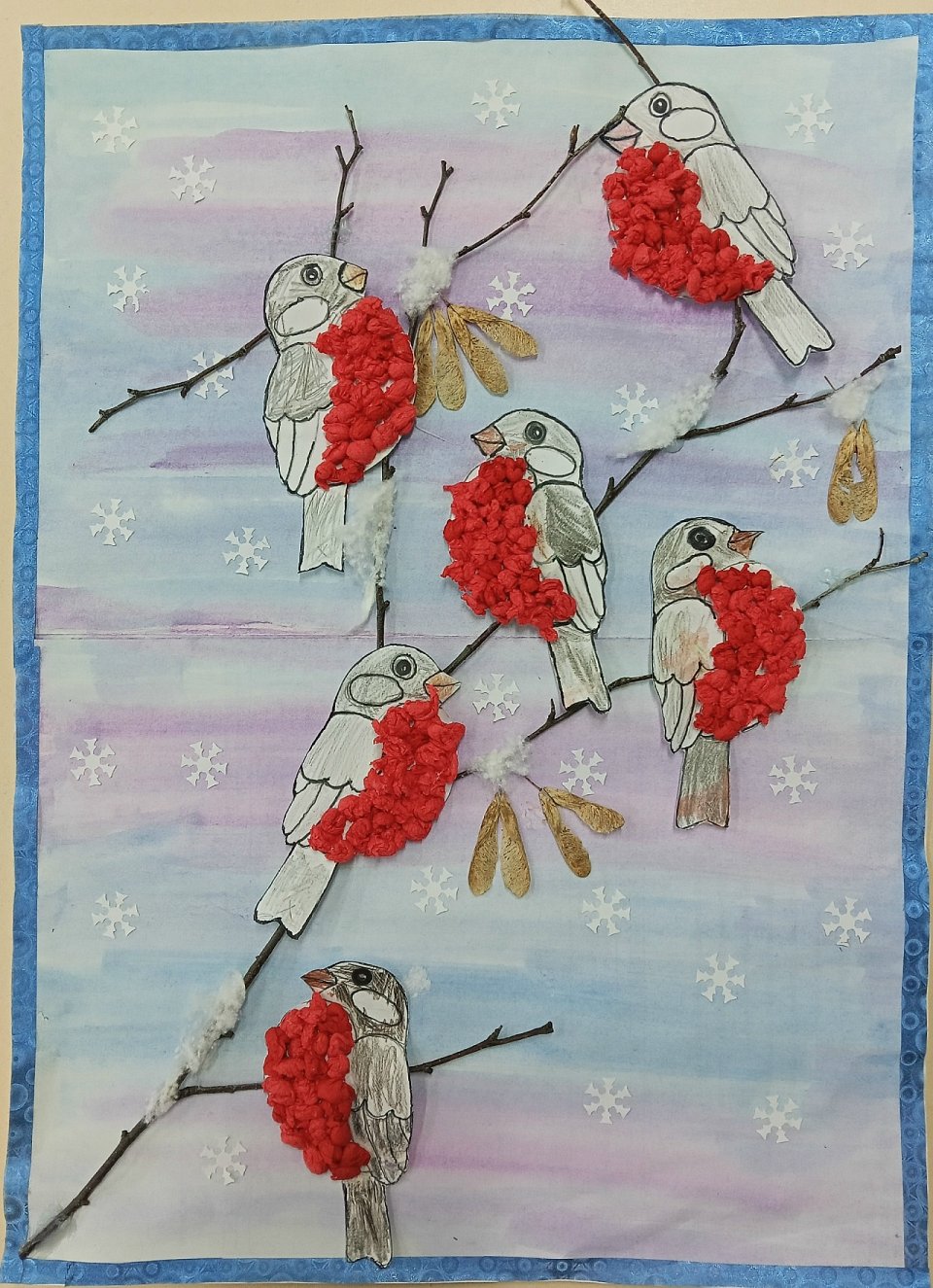 Возраст участника- 9 лет. Работа выполнена при помощи рисования и аппликации. Для создания объемной композиции были использованы: веточка клёна, "крылатки" семена клёна, грудки снегирей созданы с помощью наклеивания скрученных кусочков красной салфетки.