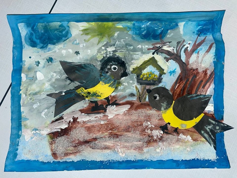 6 лет, апликация из подручных материалов(бумага, манка) краска,клей. Апликация обьемная.