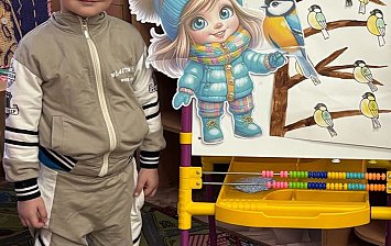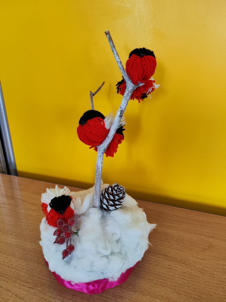 Есении 5 лет, в работе использовала - нитки ( красные,белые,черные) веточка, ягодки, шишка, вата
