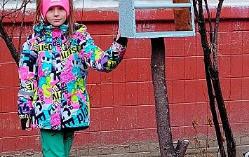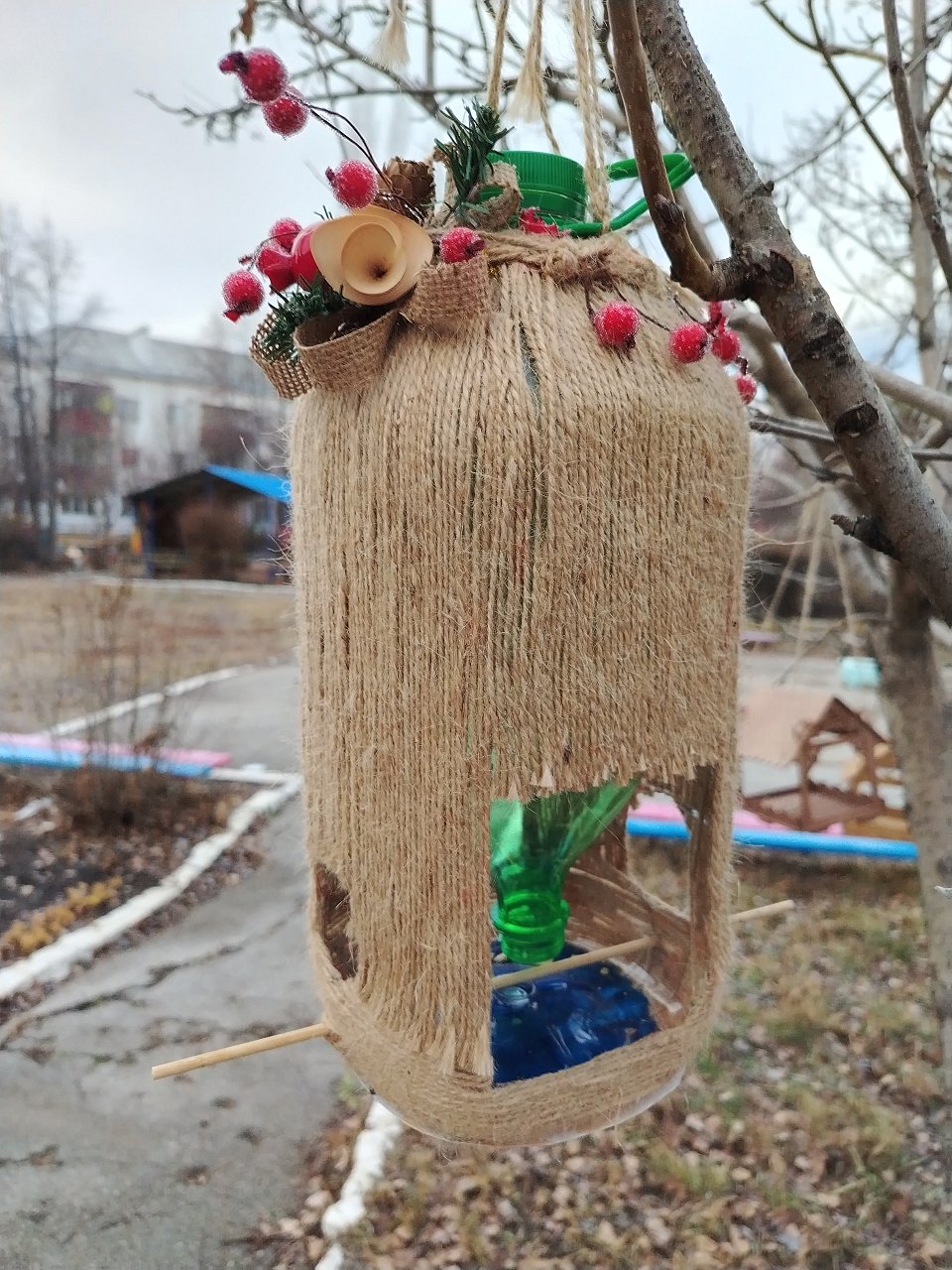 Кормушка сделана из пластиковой бутылки 5л, отделка из толстых нитей, украшена веточкой ягод. Внутри вставлена маленькая пластиковая бутылка для удобства насыпания корма. Возраст участника 5 лет