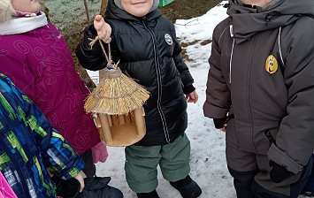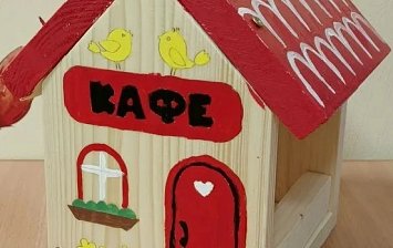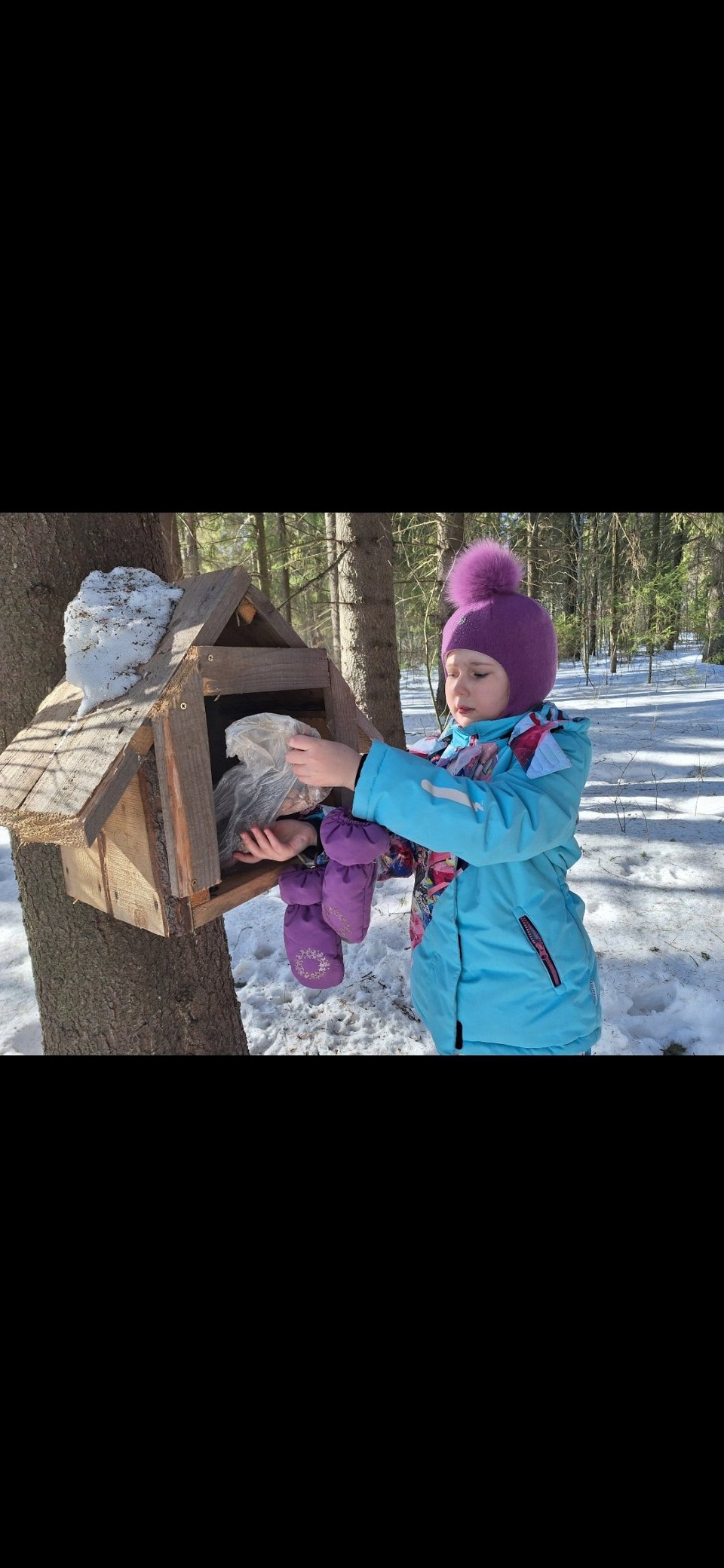 Кормушка для птиц изготовлена совместно с дедушкой из досок и фанеры. Кормушка прикреплена к дереву в лесопарке Пермского района, кормление птиц осуществляется в выходные дни (участник Конева Анастасия, 8 лет)
