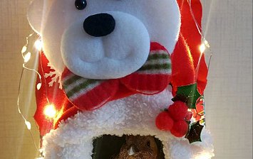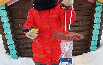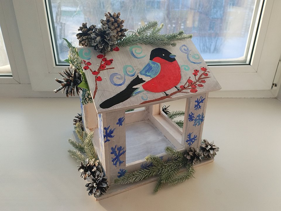 Кормушка сделана своими руками из древесины и фанеры. Раскрашена акриловыми красками и украшена веточками и сосновыми шишками