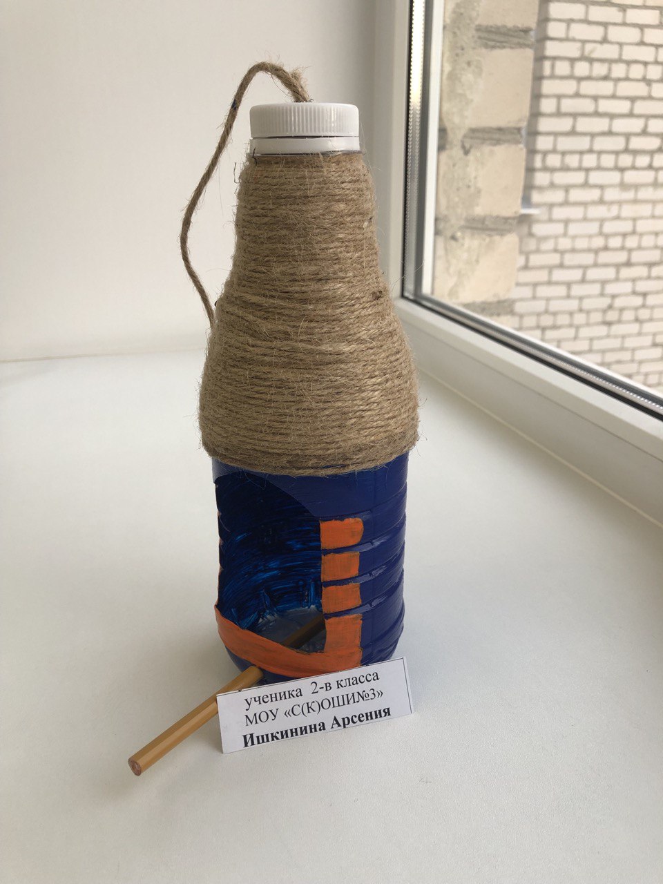 10 лет, кормушки изготовлена из пластиковой бутылки, отделка из джутового шпагата, а жёрдочка из простого карандаша.