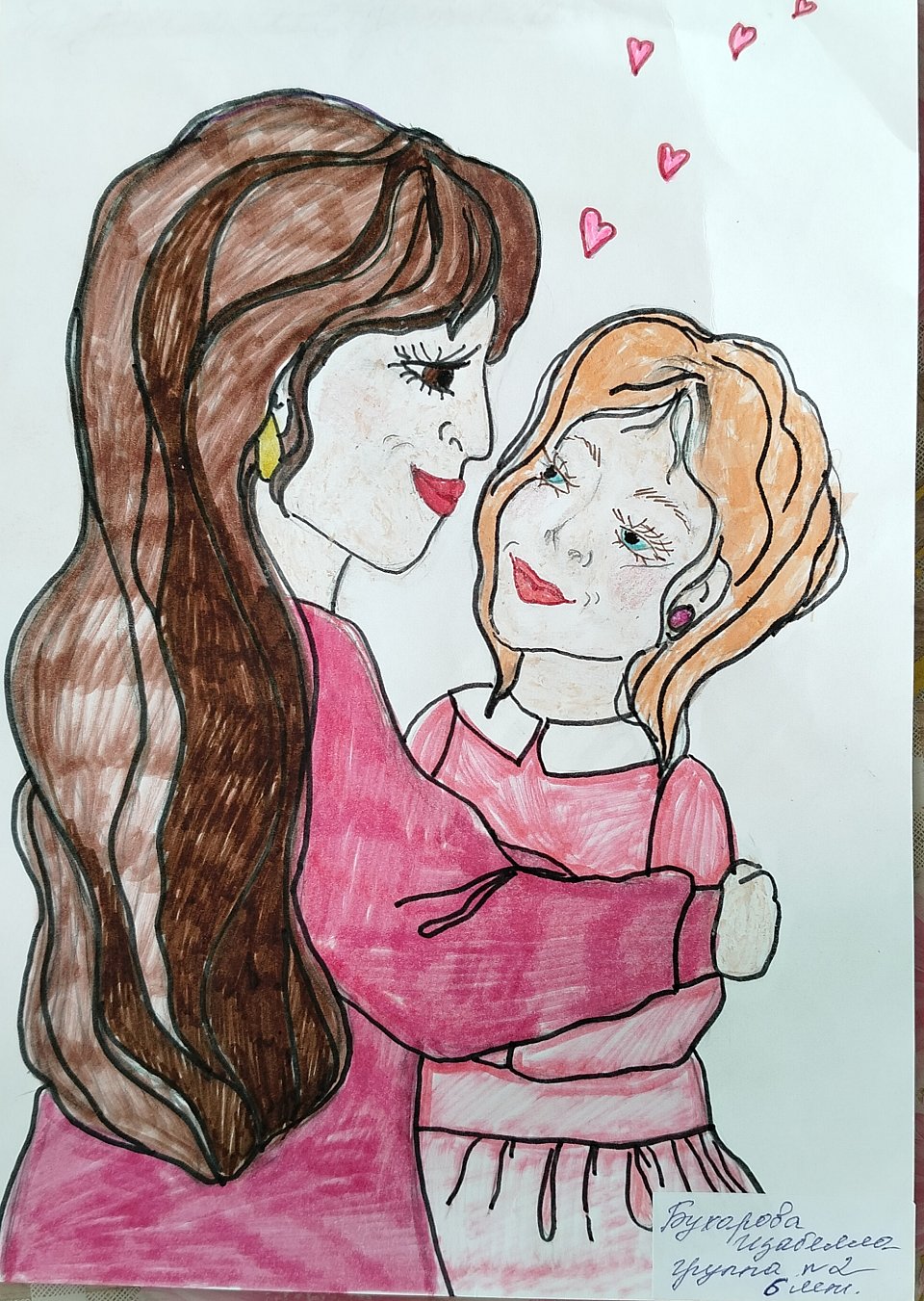 Изабелла 6 лет рисовала рисунок сначала простым карандашом, потом раскрашивала фломастерами. На рисунке изобразила маму и себя!