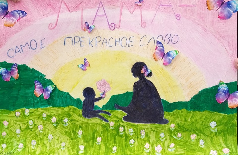 Коллектив ребят 5А класса, возраст - 11 лет, подготовили плакат, посвященный Дню Матери, использовались восковые мелки и перманентные маркеры