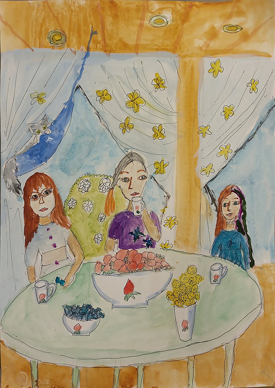 Возраст участника 9 лет .Хороший день с мамой и бабушкой. Техника - акварель, гелевая ручка.