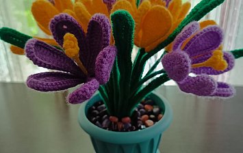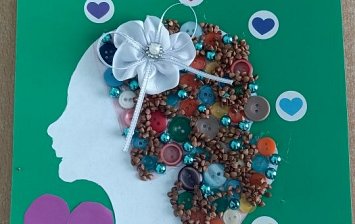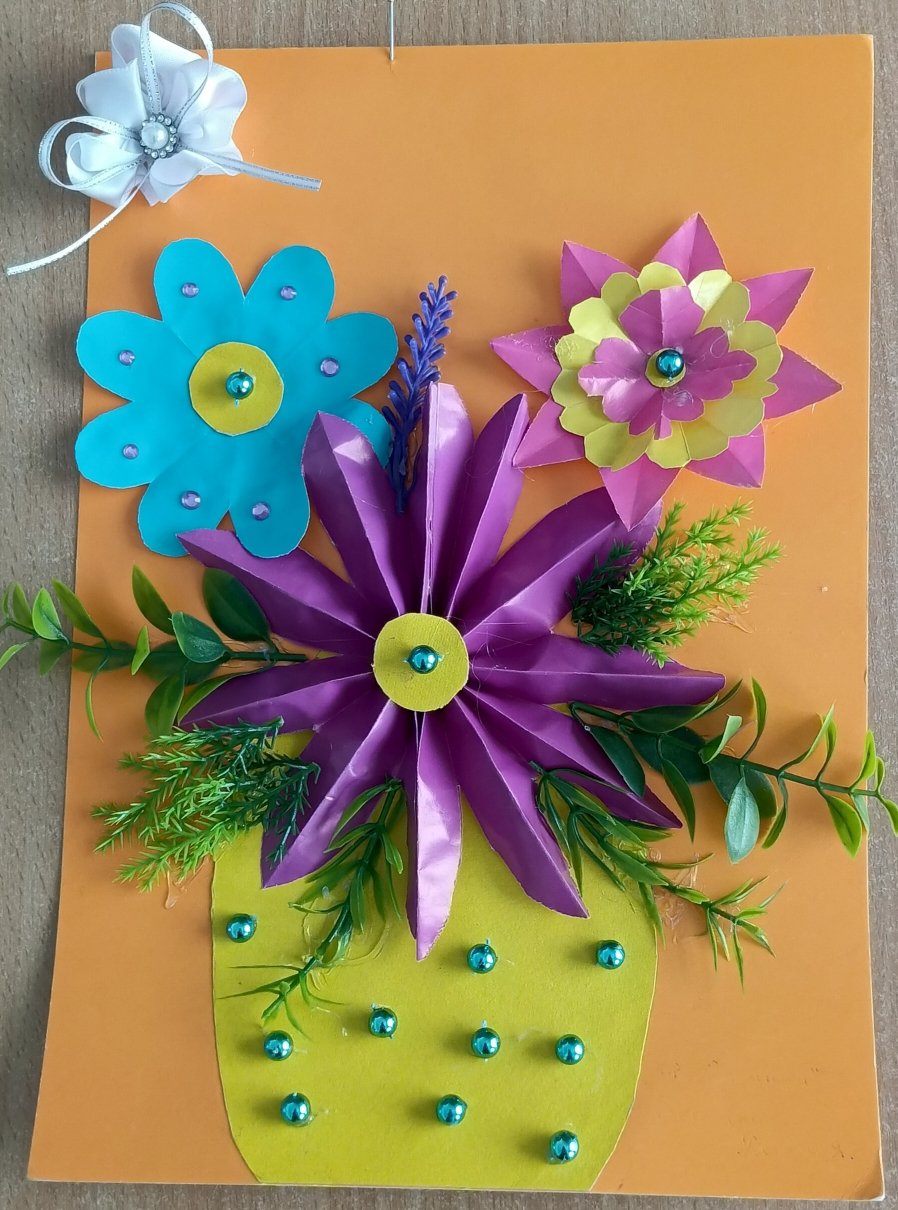 Алена, 5 лет. -цветной картон, -цветная бумага, -бусины, -декоративная зелень, -декоративный цветок для украшения.