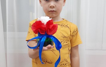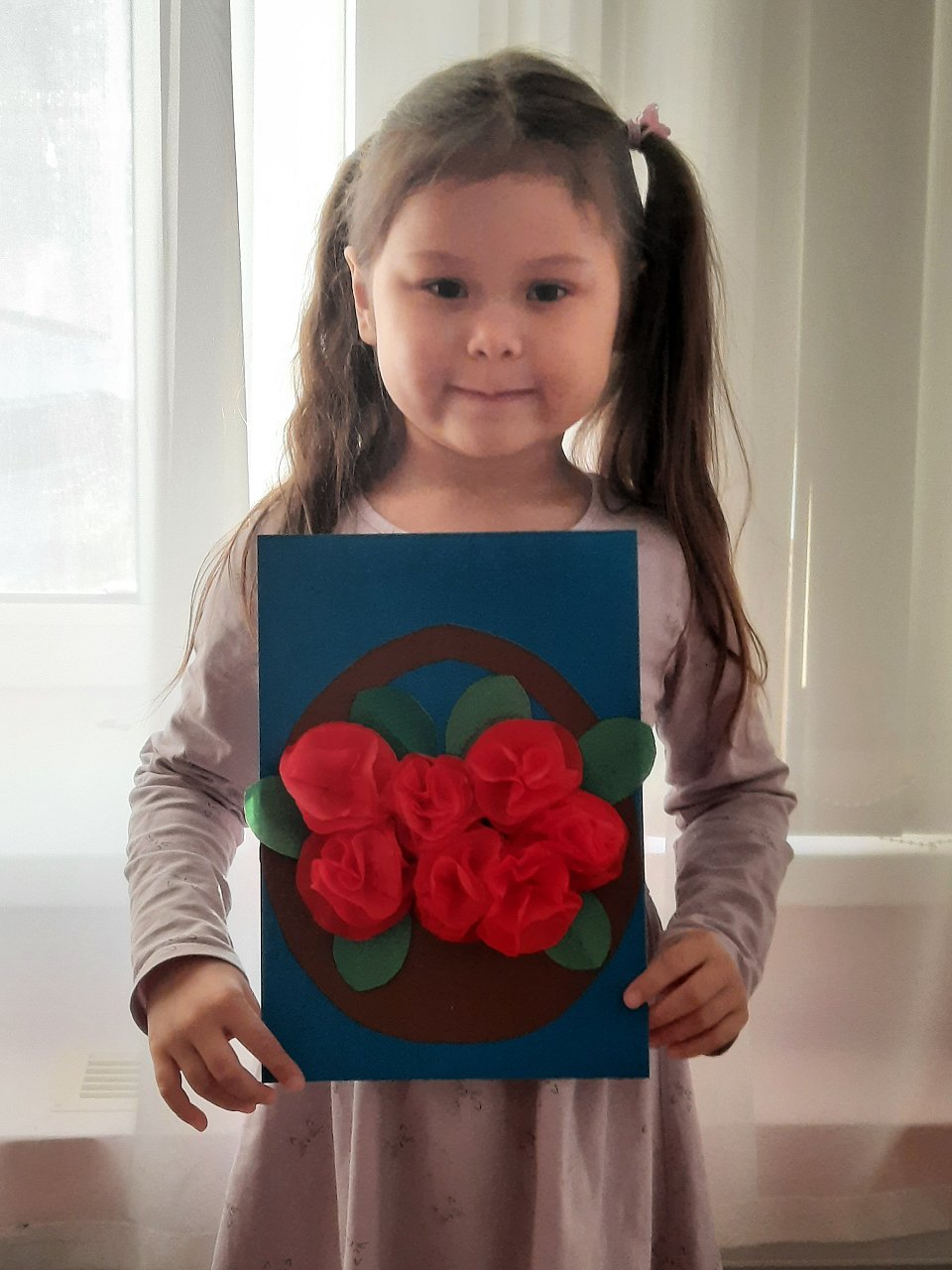 Цветы из гофрированной бумаги. Под руководством воспитателя София из квадратов вырезала кружочки для заготовки роз. С помощью степлера 4 круга соединены в центре степлером, затем поочередно сложены в пучок, и получился цветок. Заготовлено семь роз. Затем они приклеены на плотный картон в форме букета в корзинке.