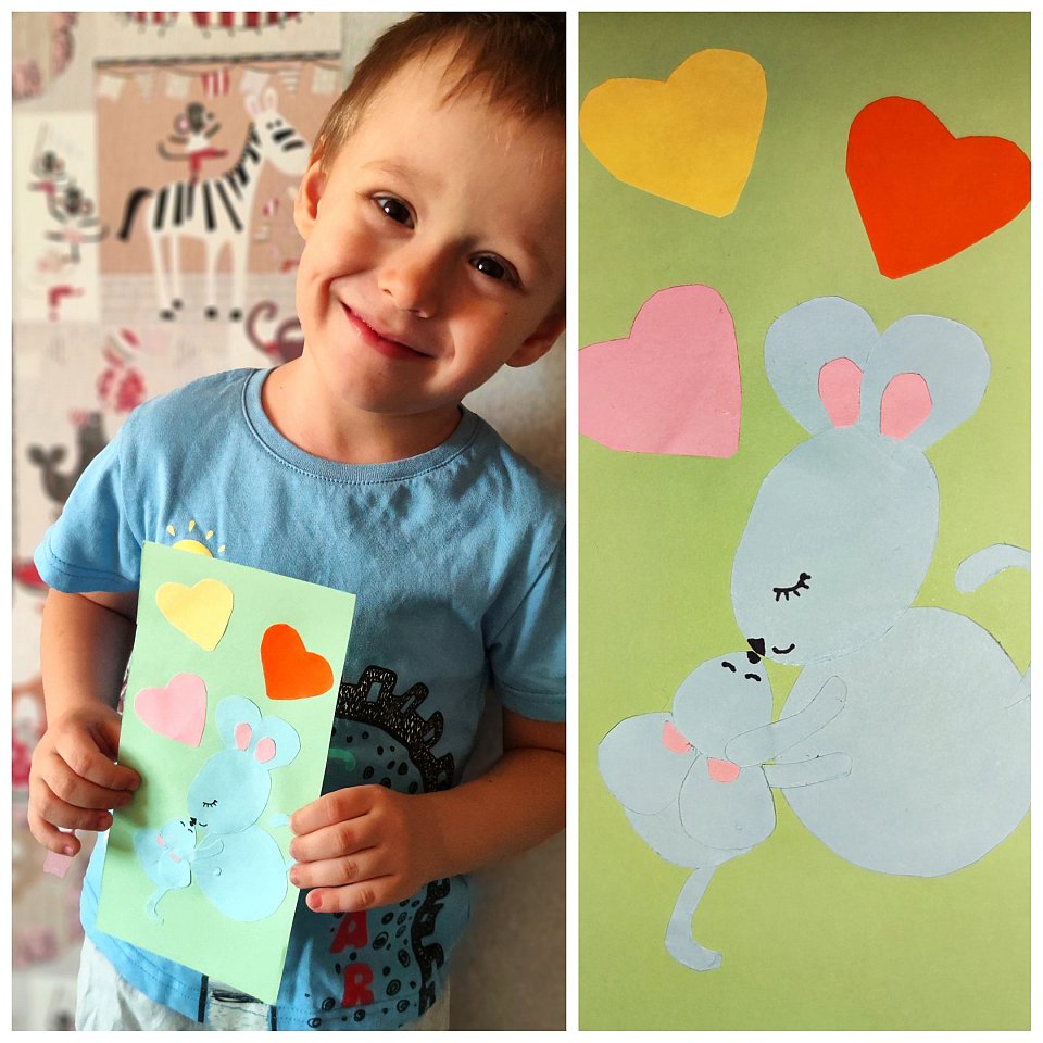 4 года, вырезание по контуру и приклеивание по образцу. Бумага, клей, картон, маркер.