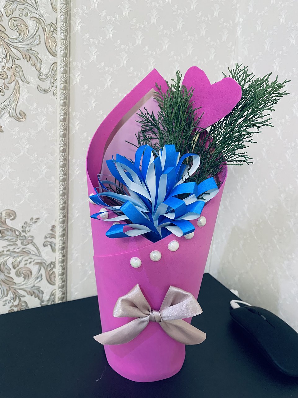 5лет, вырезание и формирование из разноцветных бумаг- букет, приклеивание клеевим пистолетом, оформление живыми растениеми