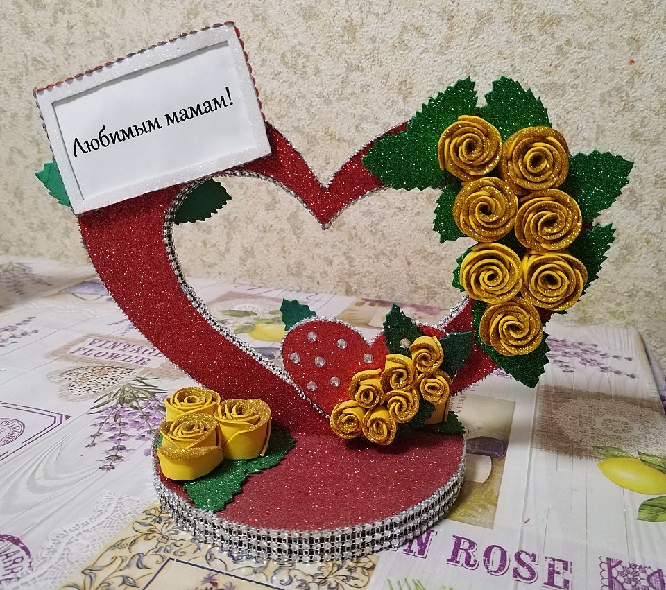 Эта оригинальная работа создана специально для тех, кто хочет порадовать свою любимую маму особенным подарком. Поделка представляет собой красивое сердце, украшенное изящными жёлтыми розами, сделанными вручную из фоамирана. Идеальный способ выразить любовь и благодарность самому близкому человеку.