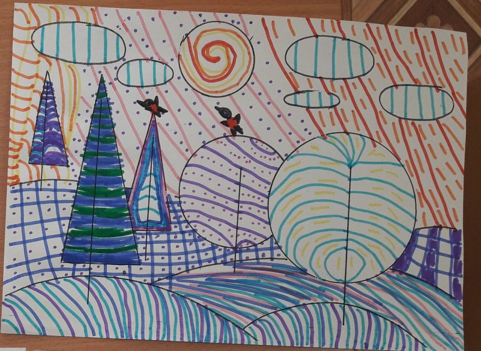 Возраст участницы: 6 лет. Техника: фломастеры, рисование линиями.