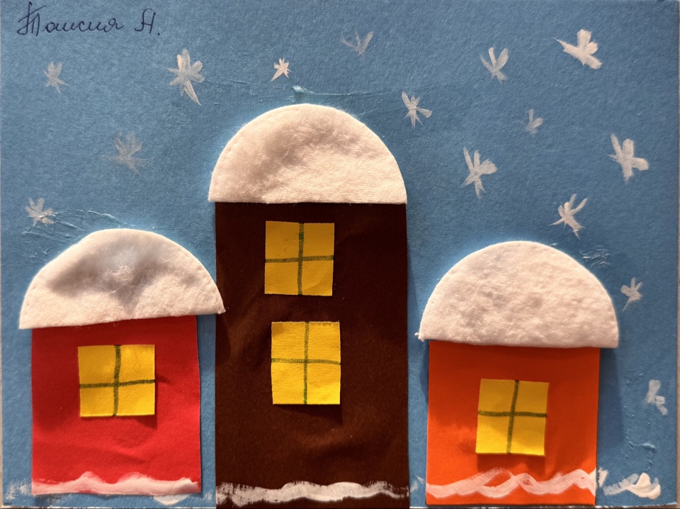Работа выполнена в технике "Аппликация". Использовались бумага, клей, ватные диски. Возраст участника - 3 года.