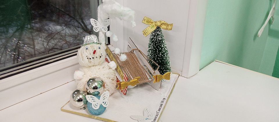 Савелию 5 лет. Работа выполнена из шерстяных ниток, пластилина, ваты, дерева, елочных игрушек.