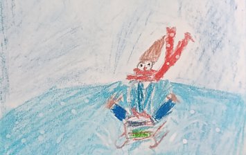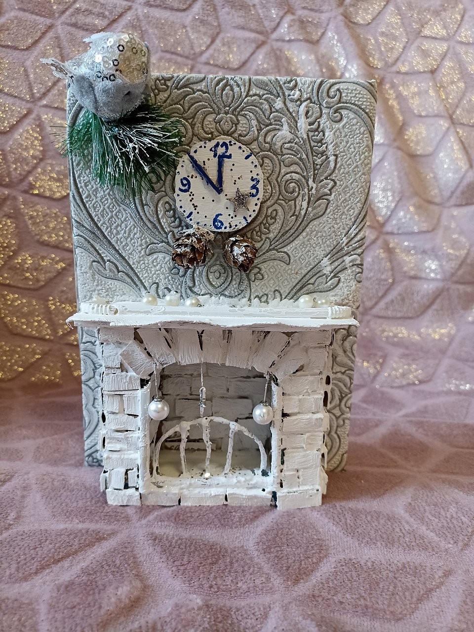 5,5 лет, поделка из картона, обоев, шишек, еловых веточек, ткани, ватных палочек, проволоки.